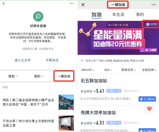 圖注:打開“好停車官微”,點(diǎn)擊右下角“一鍵加油”,即可跳轉(zhuǎn)至車主邦服務(wù)