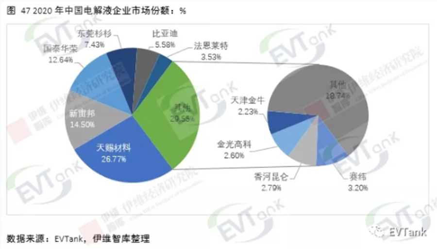 從中國(guó)主要電解液企業(yè)來(lái)看,出貨量在2萬(wàn)噸以上的企業(yè)達(dá)到4家,排名靠前的10家企業(yè)合計(jì)出貨量達(dá)到21.9萬(wàn)噸,占全部行業(yè)出貨量的81.4%。天賜材料以7.2萬(wàn)噸的出貨量排名第一,2019年出貨量排名第二的國(guó)泰華榮退居第三,新宙邦以14.5%的市場(chǎng)份額進(jìn)入第二名。