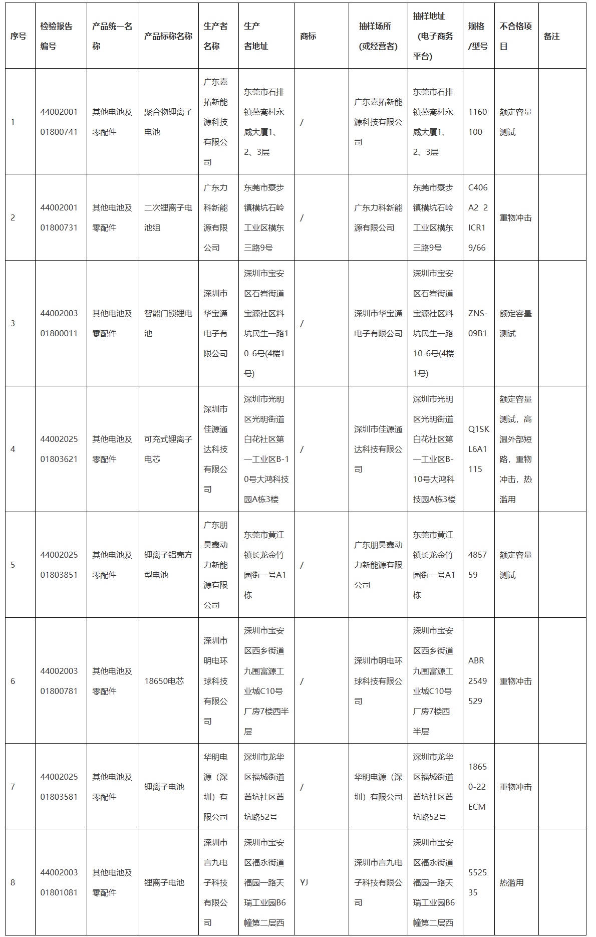 5月25日,廣東省市場監(jiān)督管理局發(fā)布2020年度廣東省電池產(chǎn)品質(zhì)量監(jiān)督抽查情況的通告,本次共對155家企業(yè)生產(chǎn)的鋰離子電池、其他電池及零配件等2類346款電池及其零部件產(chǎn)品質(zhì)量開展了監(jiān)督抽查,發(fā)現(xiàn)廣東嘉拓新能源、廣東力科新能源、深圳市華寶通電子、深圳市佳源通達(dá)、廣東朋昊鑫動力、深圳市明電環(huán)球、華明電源、深圳市言九電子等8家電池企業(yè)生產(chǎn)的8款產(chǎn)品不合格。不合格項(xiàng)目主要有:“額定容量測試”“重物沖擊”“高溫外部短路”“熱濫用”。