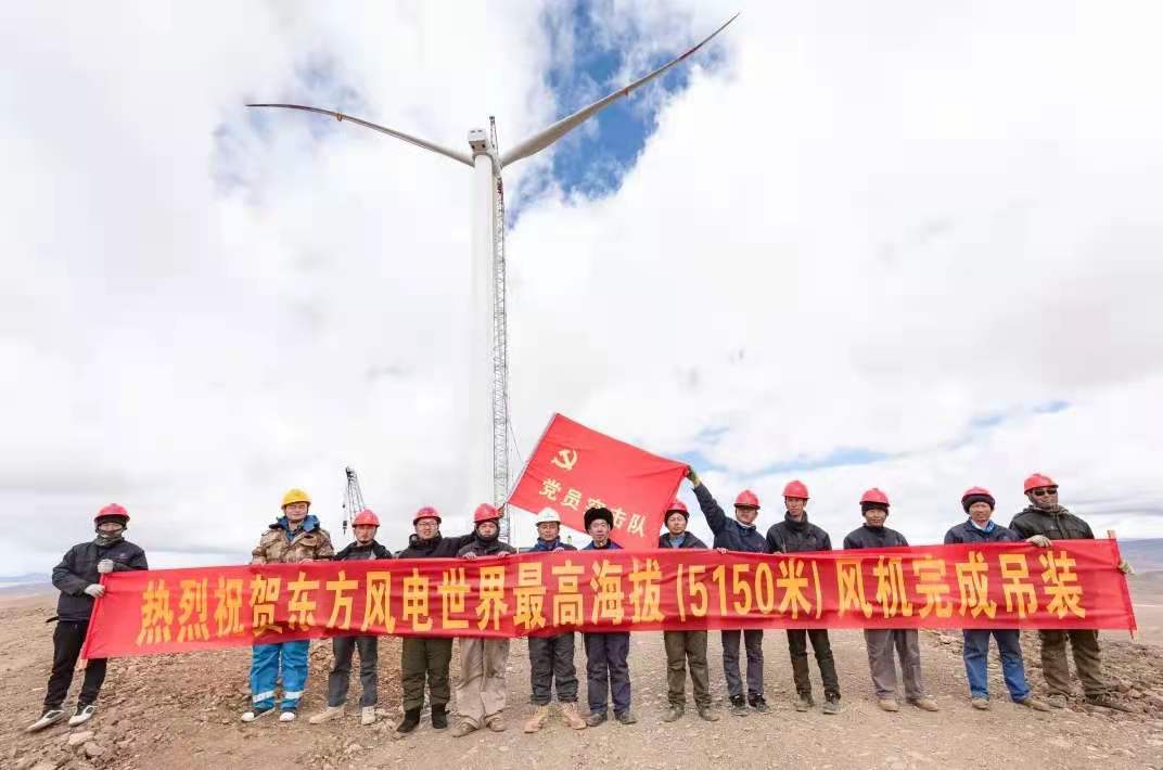6月6日,世界最高海拔風電場——西藏措美縣哲古分散式風電項目現場傳回捷報:東方風電為該項目研制的2.X-131型永磁直驅風電機組順利完成吊裝,機位海拔高度5060米,機組輪轂中心海拔高度5150米,是目前世界安裝海拔高度最高的風電機組,標志著東方風電已完全具備超高海拔風電機組自主研發、制造、安裝能力,實現挑戰5000米以上超高海拔風電“無人區”的歷史性跨越,這是東方風電勇擔“碳達峰”“碳中和”宏偉目標使命,推動新能源發展的又一重大成果。