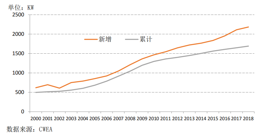 2000年至2018年中國新增和累計裝機的風電機組平均功率