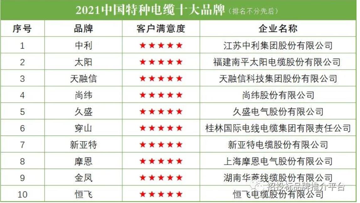 附:2021中國特種電纜十大品牌(排名不分先后)