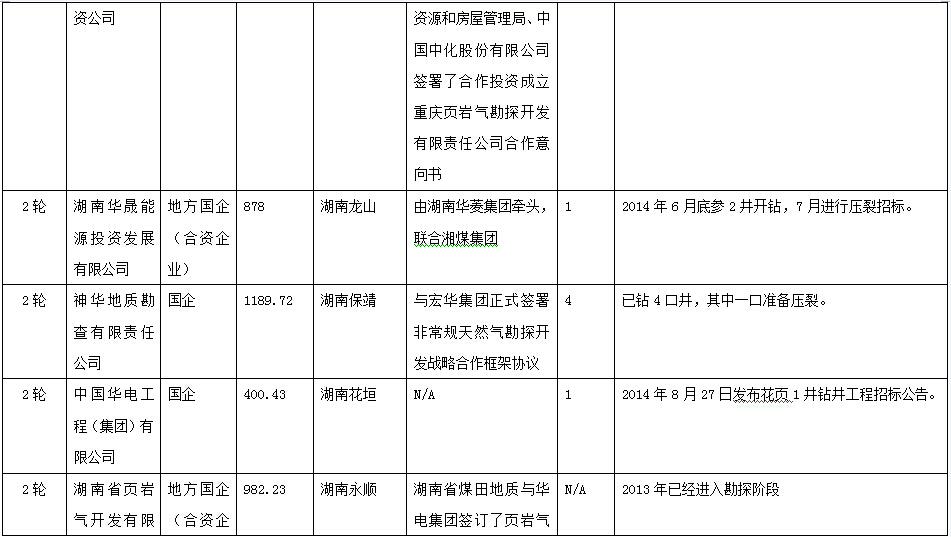 第二輪頁巖氣礦業權出讓中標單位,大都完成了二維地震勘探。部分企業完成預探井鉆探,多數企業處于探井井位論證階段或預探井開鉆階段;還有部分企業處于觀望階段。截至2015年2月,除一二輪招標區塊之外,在湖南慈利縣、山東東營、內蒙古自治區鄂爾多斯市的頁巖氣勘探都取得了重要突破。